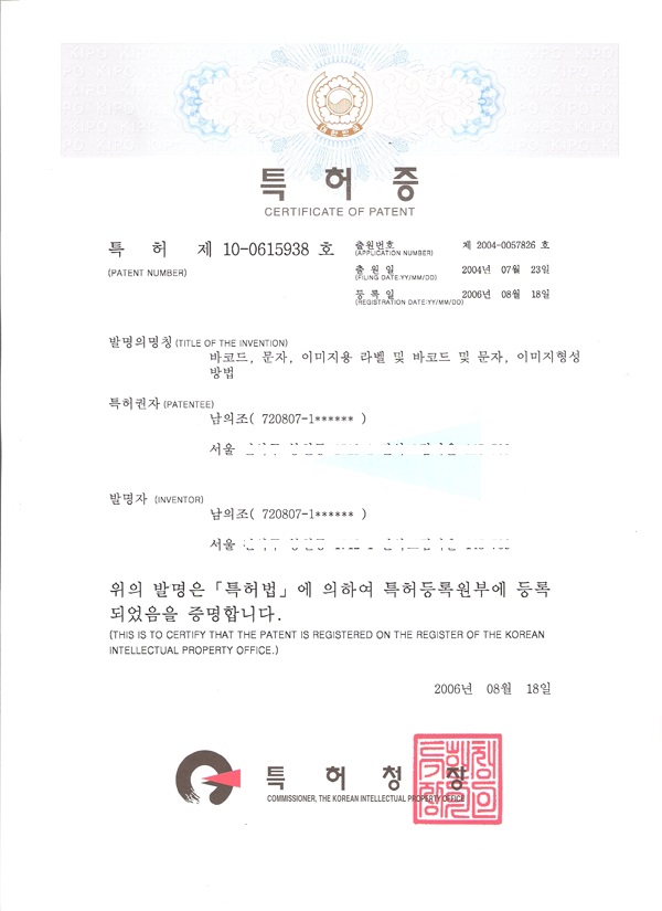 Patent (Applied in 2004, registered in 2006, indelible laser barcode label)